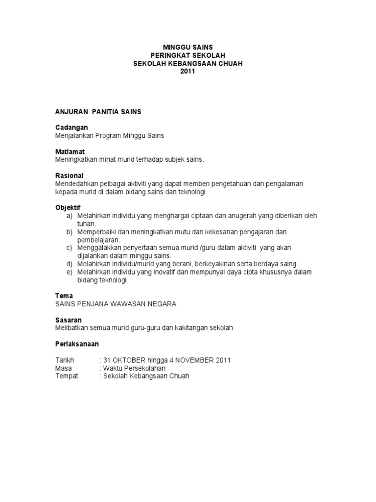 Program-program yang dirancang adalah. SEKOLAH KEBANGSAAN BESOUT 5 35600 SUNGKAI PERAK DARUL RIDZUAN KERTAS KERJA PROGRAM MINGGU SAINS DAN MATEMATIK 2016 TARIKH PELAKSANAAN. KERTAS CADANGAN MINGGU SAINS ANJURAN PANITIA SAINS.